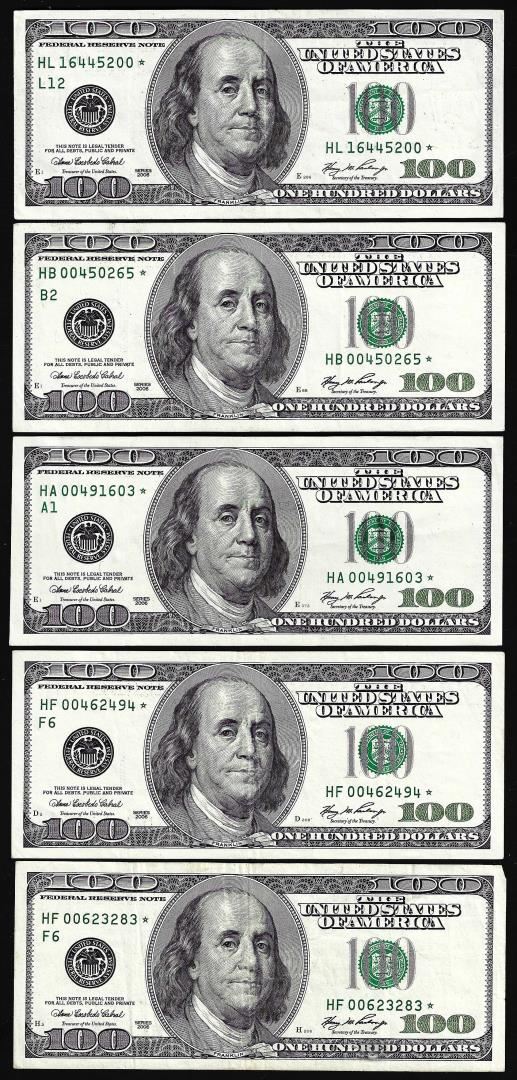 One Lot of (5) 2006 $100 Federal Reserve Star Notes.