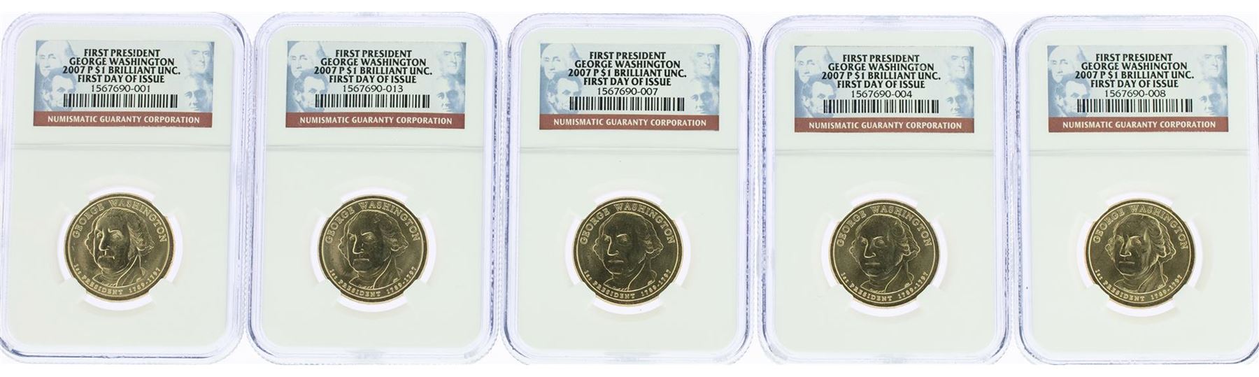 One Lot of (5) 2007-P George Washington Presidential Dollar Coins NGC BU FDOI. NGC Certified.