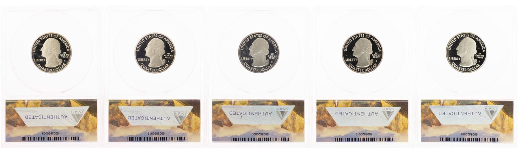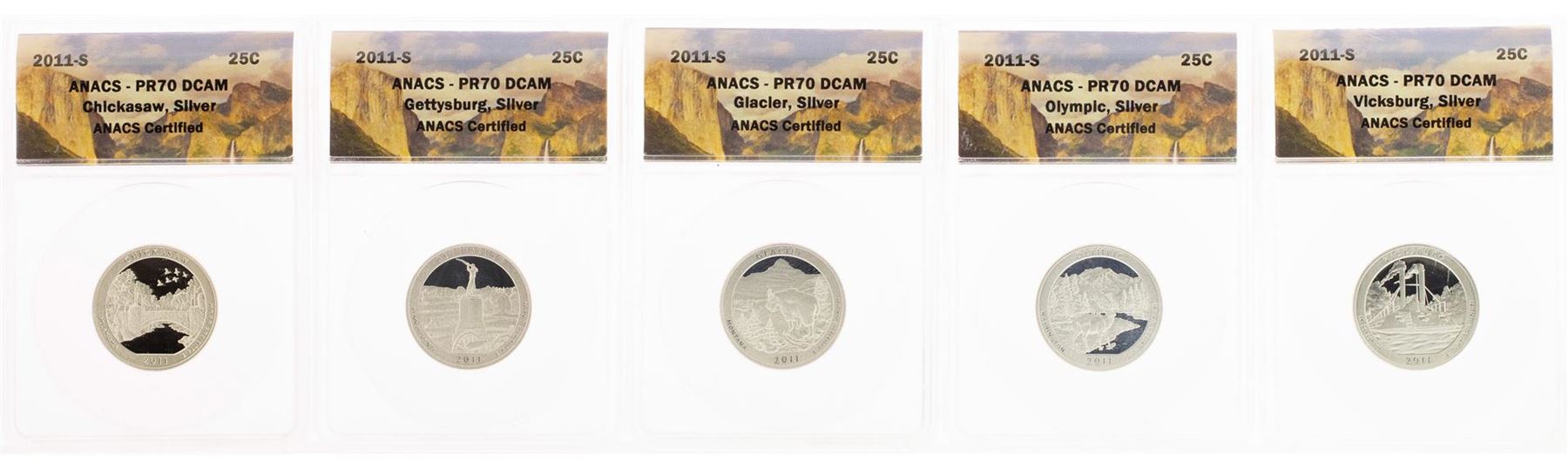 One Lot of (5) 2011-S Proof Silver America Beautiful Quarter Coins ANACS PR70 DCAM. ANACS Certified.