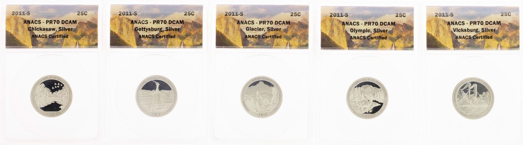 One Lot of (5) 2011-S Proof Silver America Beautiful Quarter Coins ANACS PR70 DCAM.