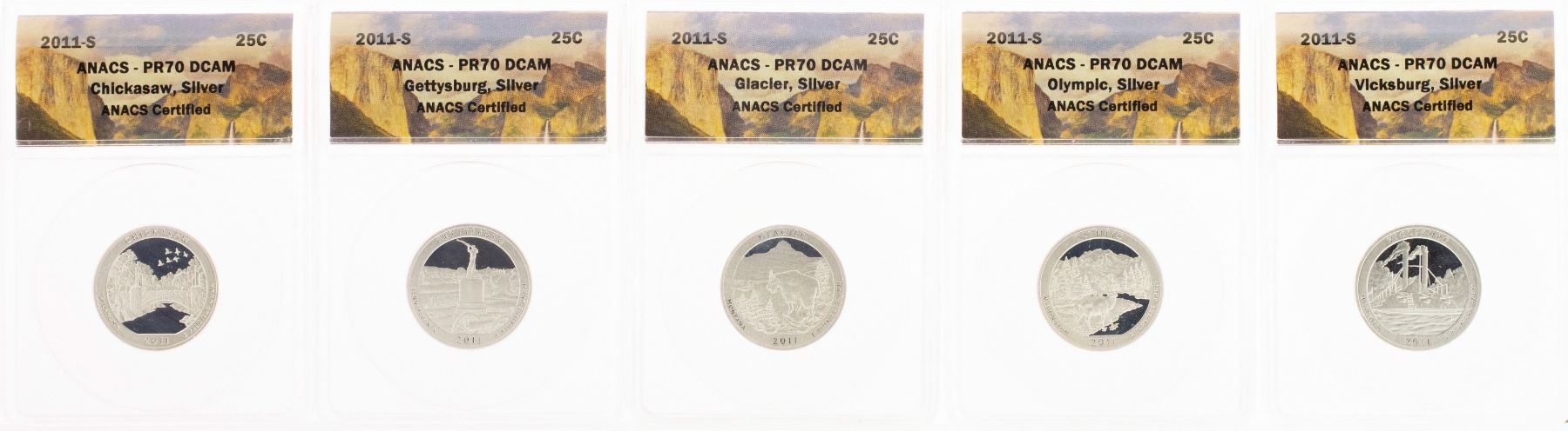 Lot of (5) 2011-S Proof Silver America Beautiful Quarter Coins ANACS PR70 DCAM