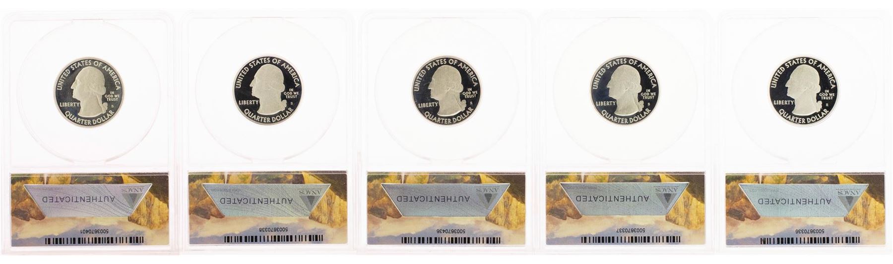 One Lot of (5) 2012-S Proof Silver America Beautiful Quarter Coins ANACS PR70 DCAM. ANACS Certified.