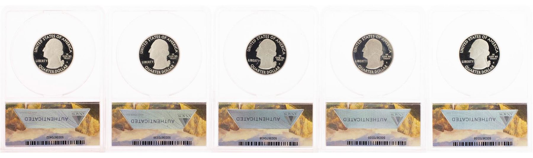One Lot of (5) 2012-S Proof Silver America Beautiful Quarter Coins ANACS PR70 DCAM. ANACS Certified.