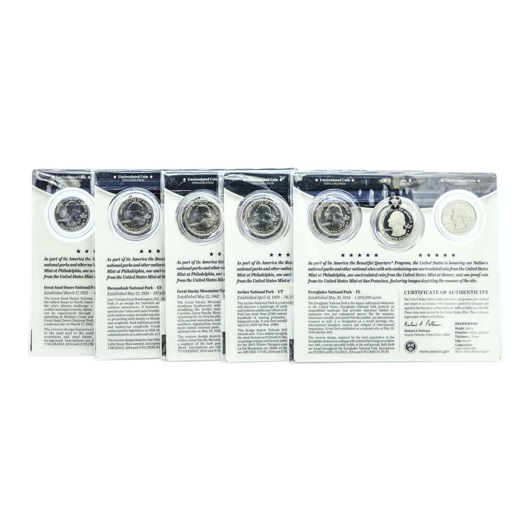 One Lot of (5) 2014 America The Beautiful Three-Coin Quarter Sets.