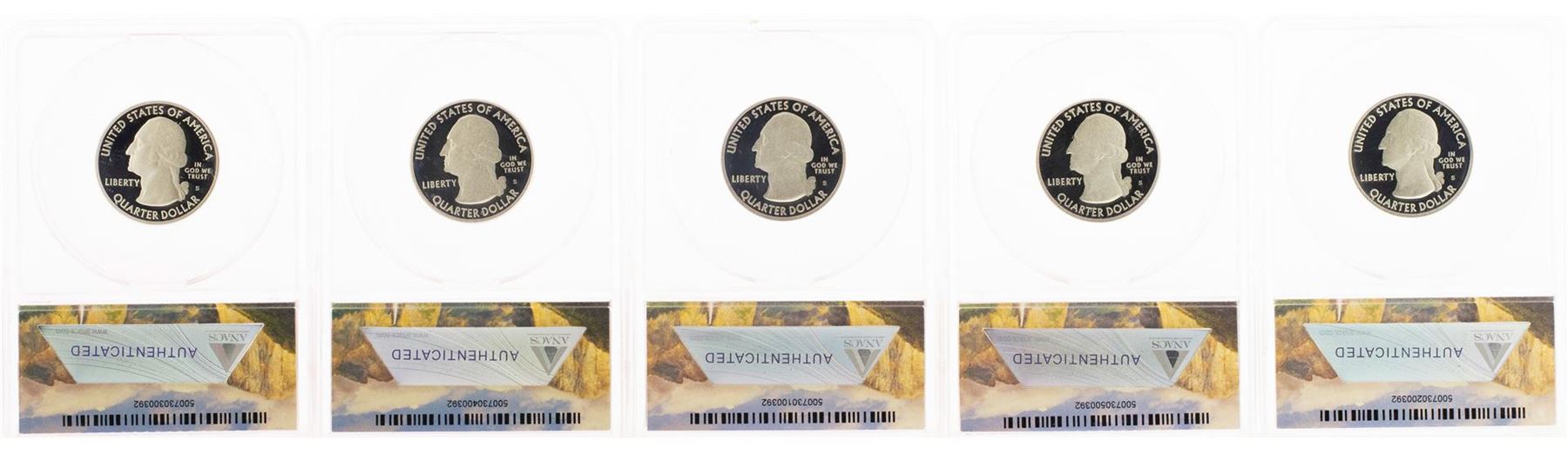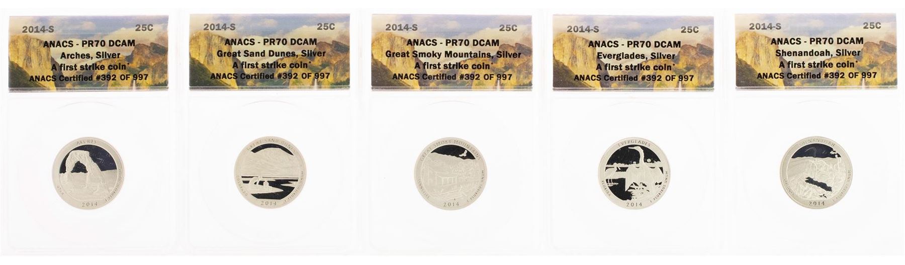 One Lot of (5) 2014-S Proof Silver America Beautiful Quarter Coins ANACS PR70 DCAM. ANACS Certified.