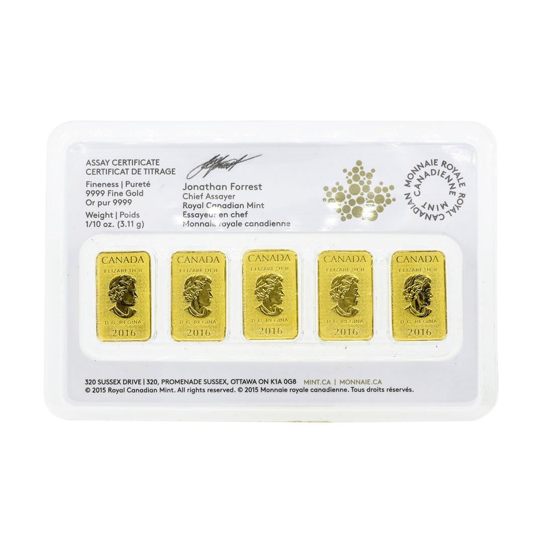 One Lot of (5) 2016 1/10oz Royal Canadian Mint .9999 Fine Gold Ingots.