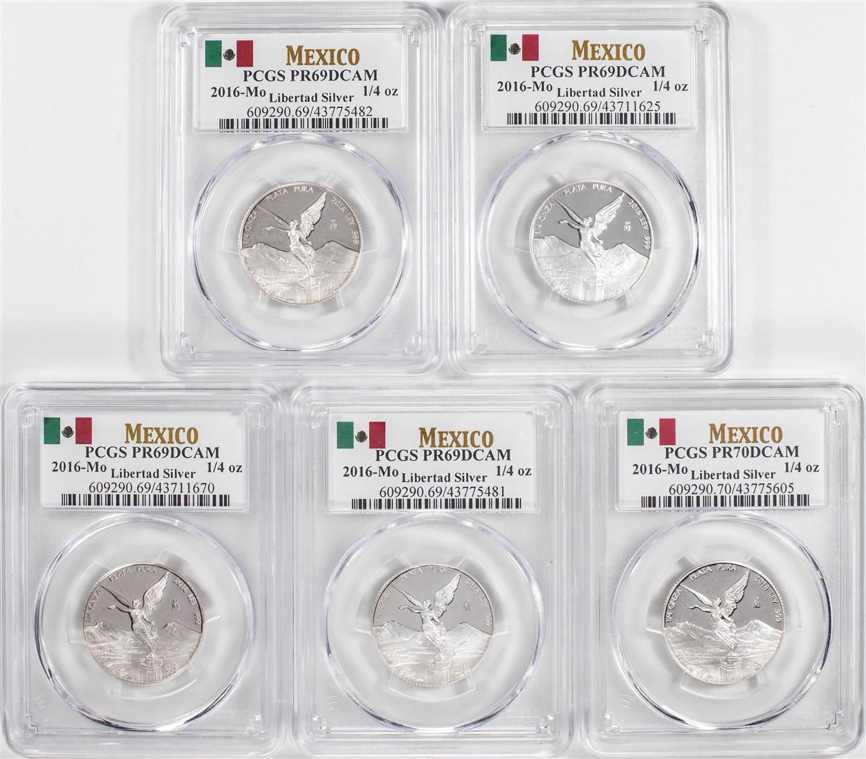 Lot of (5) 2016-Mo Mexico Proof 1/4 oz Silver Libertad Coins PCGS PR69DCAM