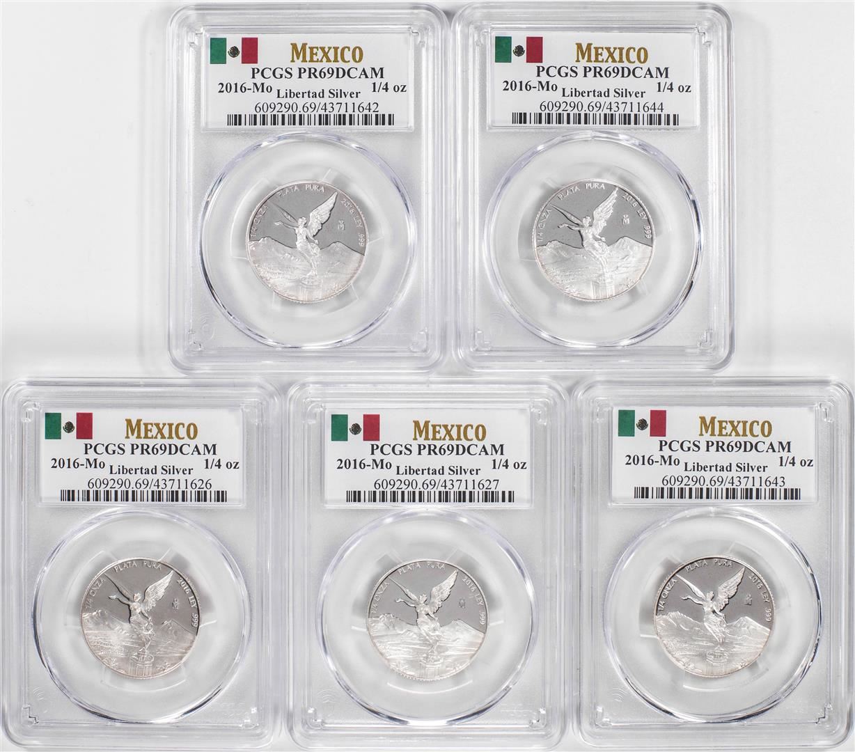 Lot of (5) 2016-Mo Mexico Proof 1/4 oz Silver Libertad Coins PCGS PR69DCAM