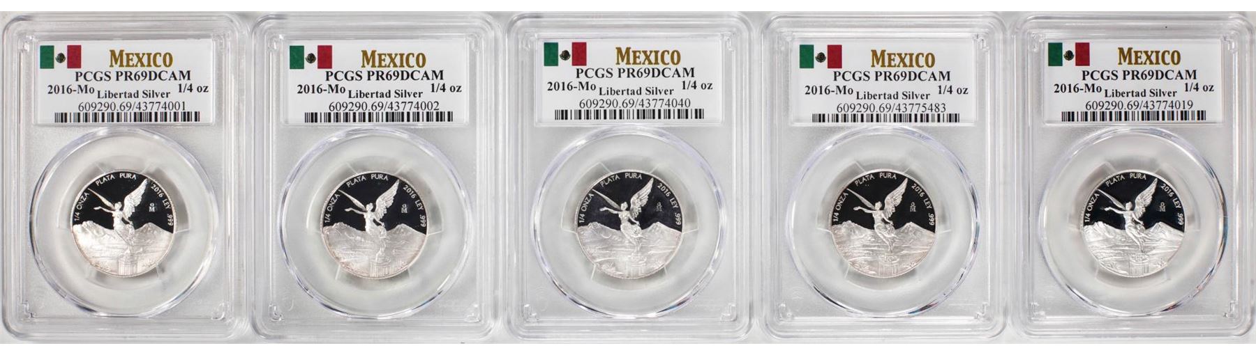One Lot of (5) 2016-Mo Mexico Proof 1/4 oz Silver Libertad Coins PCGS PR69DCAM. PCGS Graded.