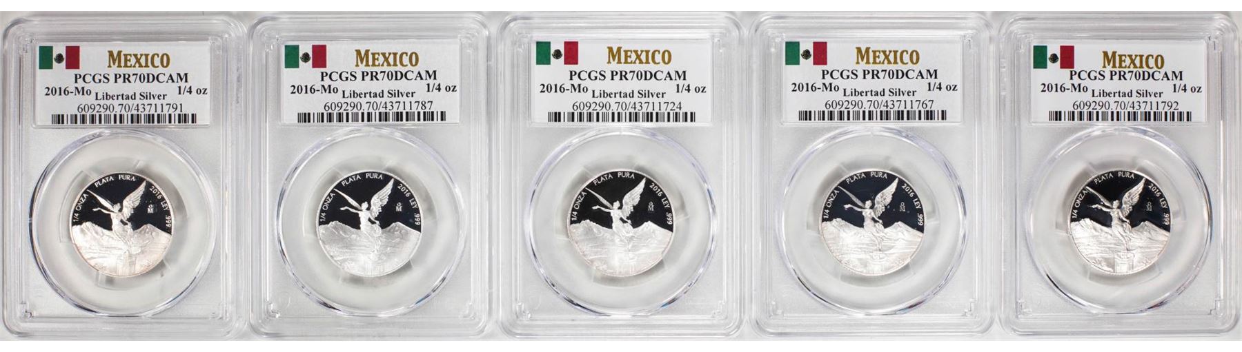 One Lot of (5) 2016-Mo Mexico Proof 1/4 oz Silver Libertad Coins PCGS PR70DCAM. PCGS Graded.
