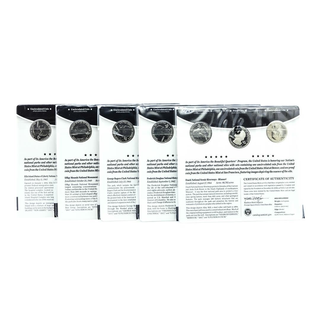 Lot of (5) 2017 America The Beautiful Three-Coin Quarter Sets, including (1) three coin set from each of the following:.