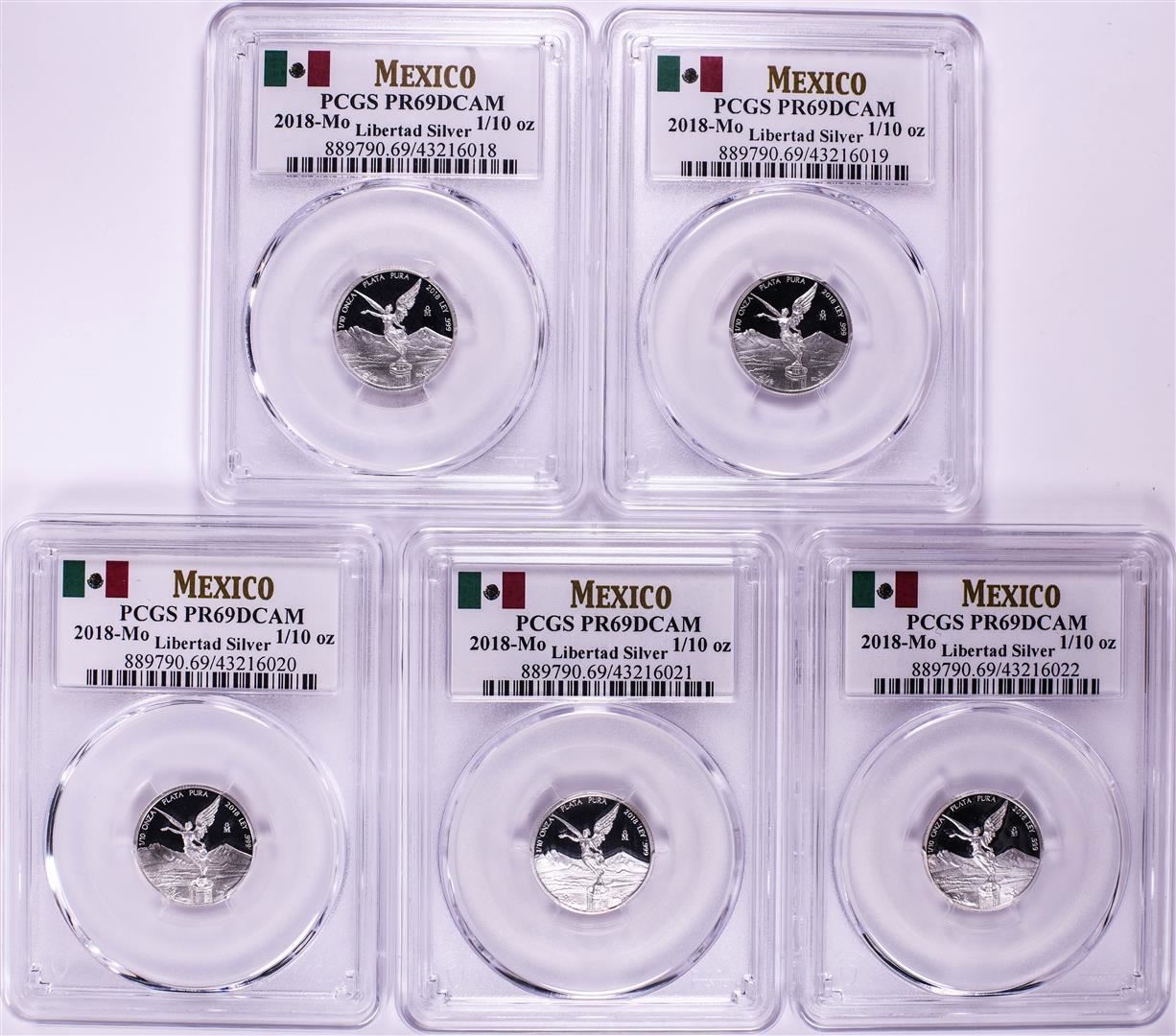 Lot of (5) 2018-Mo Mexico Proof 1/10 oz Silver Libertad Coin PCGS PR69DCAM