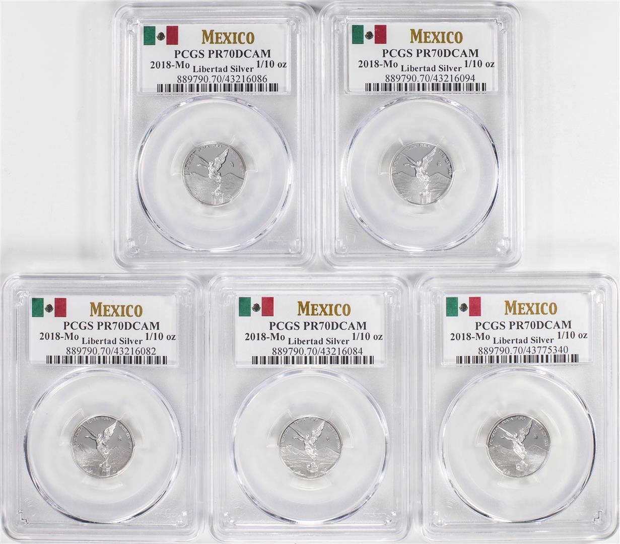 Lot of (5) 2018-Mo Mexico Proof 1/10 oz Silver Libertad Coins PCGS PR70DCAM