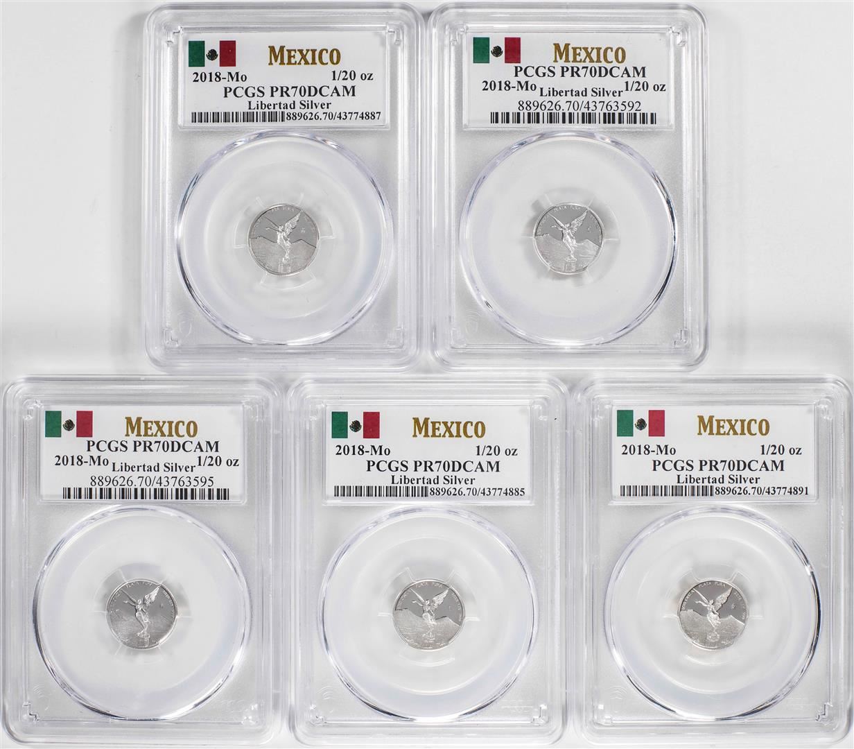 Lot of (5) 2018-Mo Mexico Proof 1/20 oz Silver Libertad Coin PCGS PR70DCAM