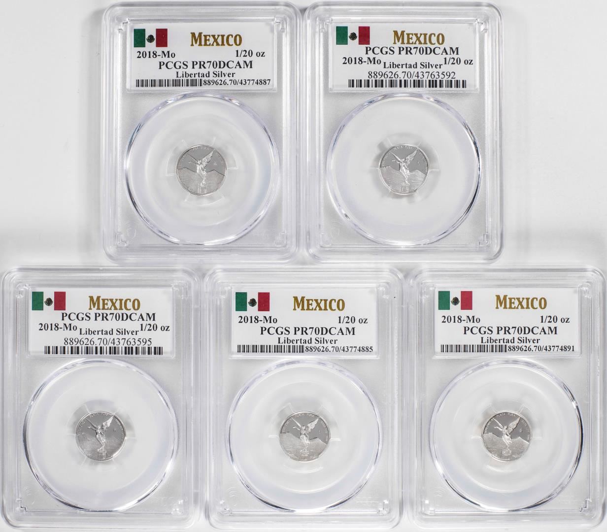 Lot of (5) 2018-Mo Mexico Proof 1/20 oz Silver Libertad Coin PCGS PR70DCAM