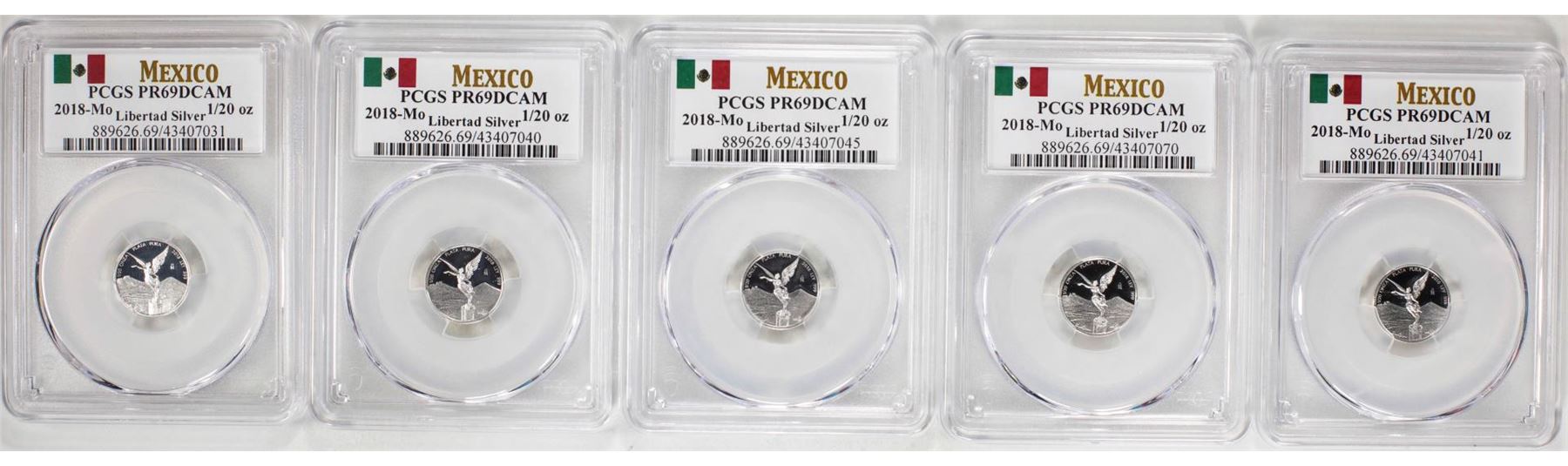 Lot of (5) 2018-Mo Mexico Proof 1/20 oz Silver Libertad Coins PCGS PR69DCAM