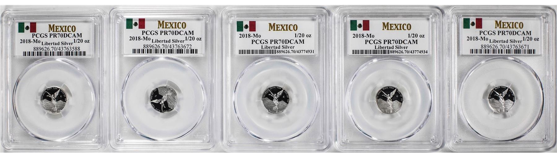 Lot of (5) 2018-Mo Mexico Proof 1/20 oz Silver Libertad Coins PCGS PR70DCAM
