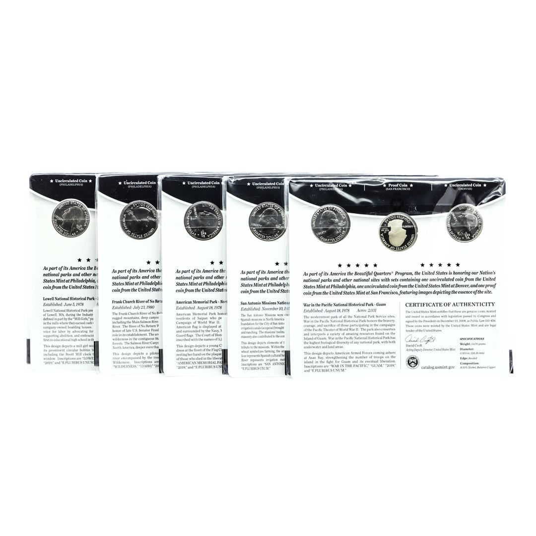 Lot of (5) 2019 America The Beautiful Three-Coin Quarter Sets, including (1) three coin set from each of the following:.