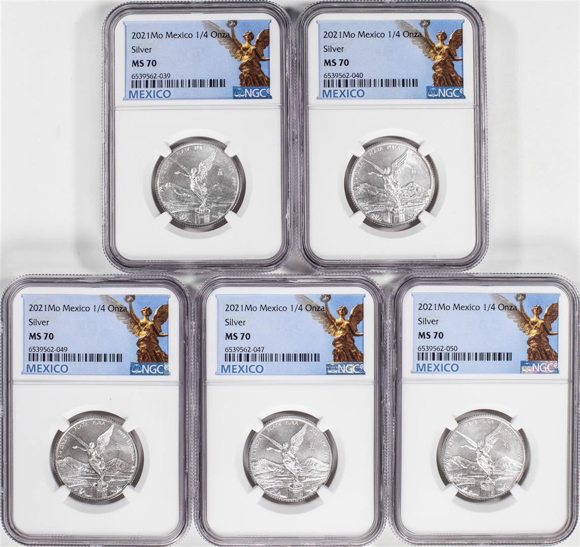 Lot of (5) 2021-Mo Mexico 1/4 oz Silver Libertad Coins NGC MS70