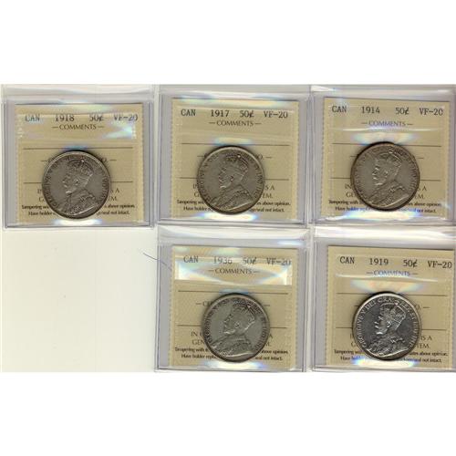 Lot of 5 50¢ coins all ICCS VF20. Includes 1914, 1917, 1918, 1919 and 1936
