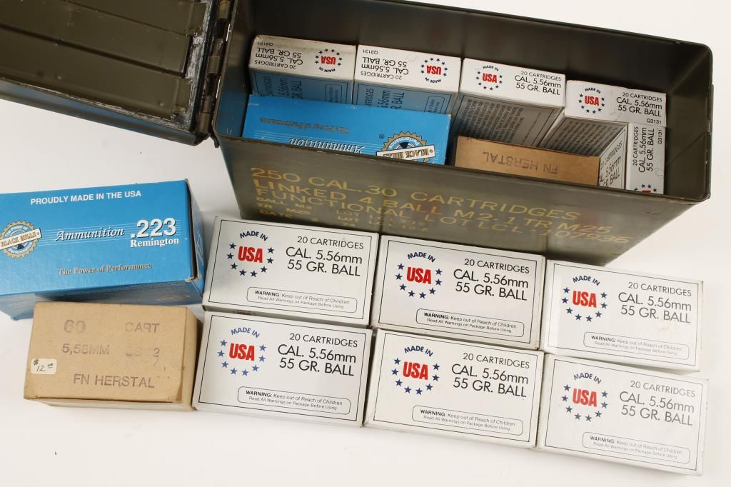 Includes approx. 440 rounds total in original boxes. In small green metal ammo can.