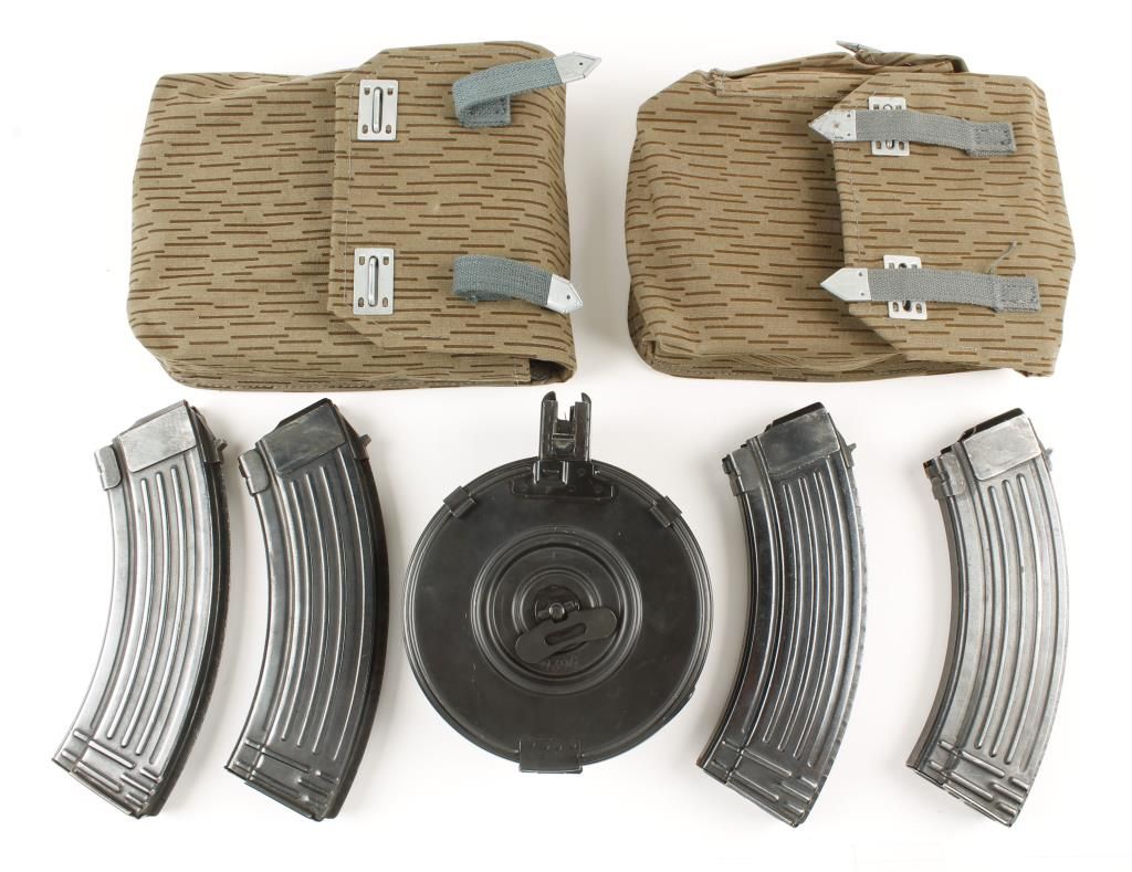 Includes (1)drum mag, and (4) 20 round mags\ in military belt pouch.