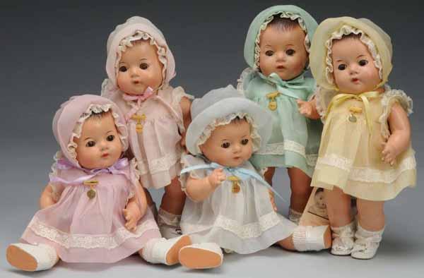 Description American, Ca. 1935. Composition toddlers signed Dionne Alexander, with molded hair, sleeping eyes, closed mouths. Compo has some light crazing and wear. Dolls are redressed in vintage organdy and lace dress in appropriate style and colors. Reproduction name pins. Condition (Very Good). Size All: 11" T.