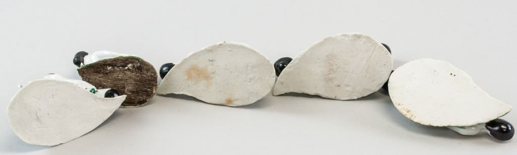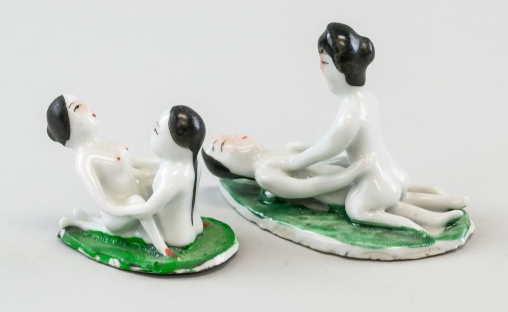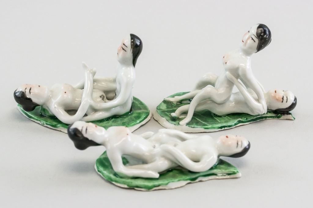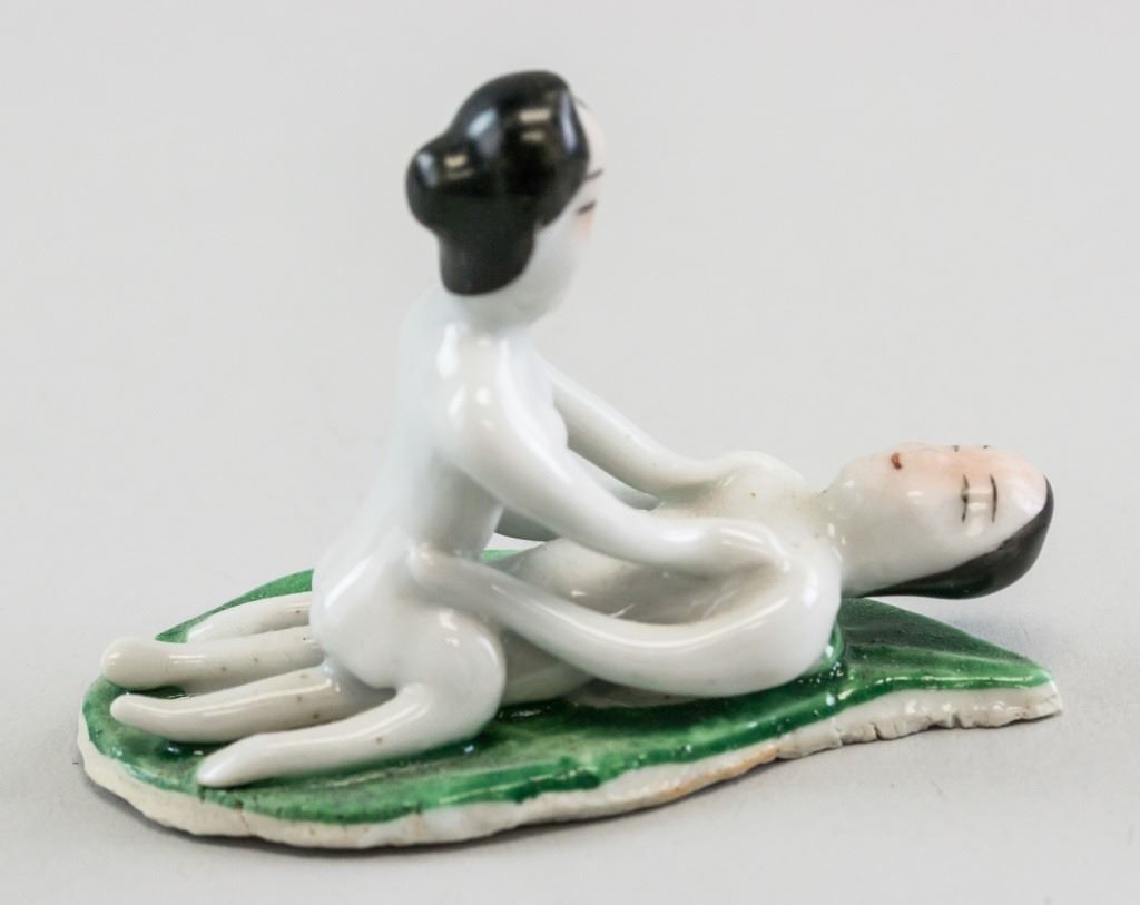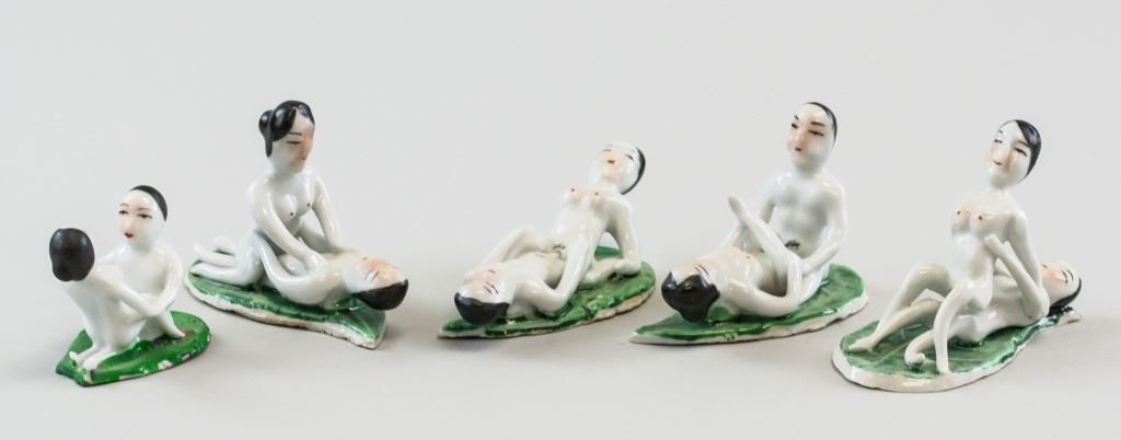 Set of 5 porcelain couples. Each in different position. White porcelain bodies on green leaf. 5.5 x 7.5 cm (each approximately), 239 grams (total).