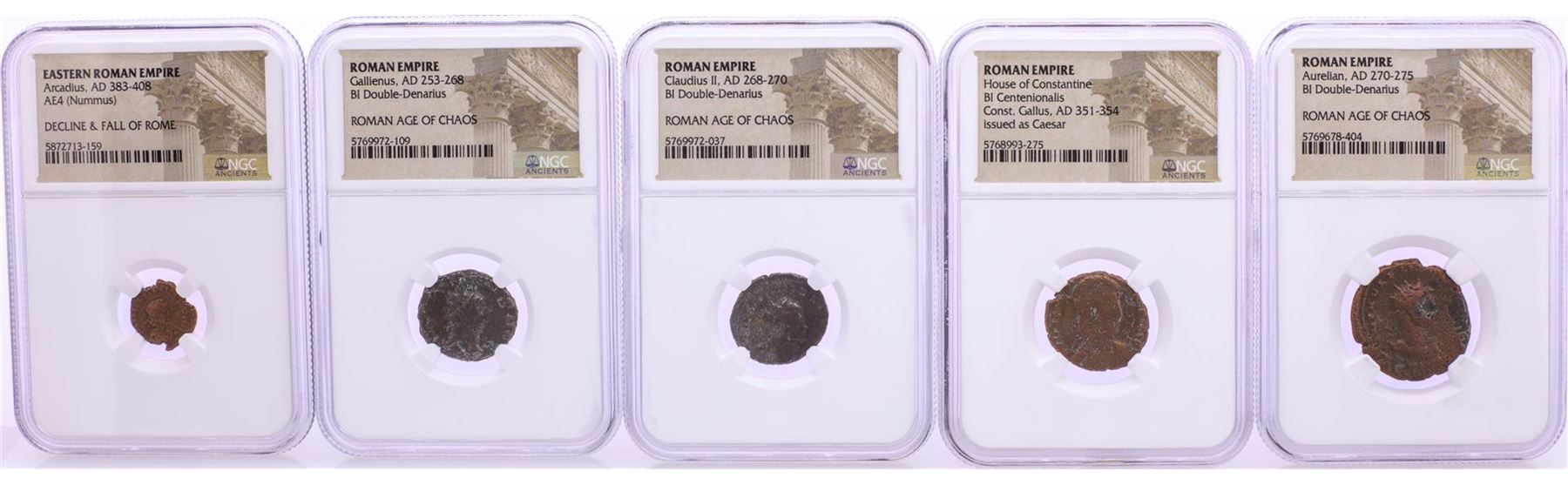 One Lot of (5) Ancient Roman Empire Coins NGC Certified. NGC Certified.