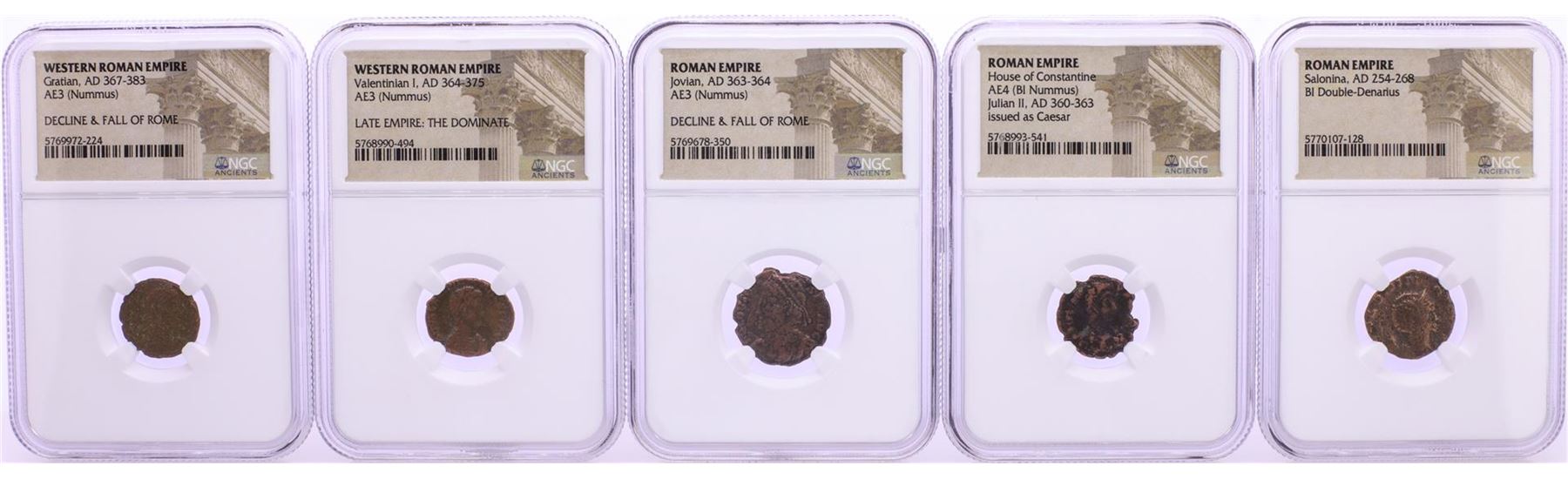 One Lot of (5) Ancient Roman Empire Coins NGC Certified. NGC Certified.