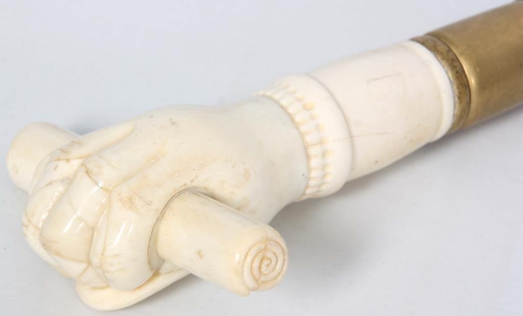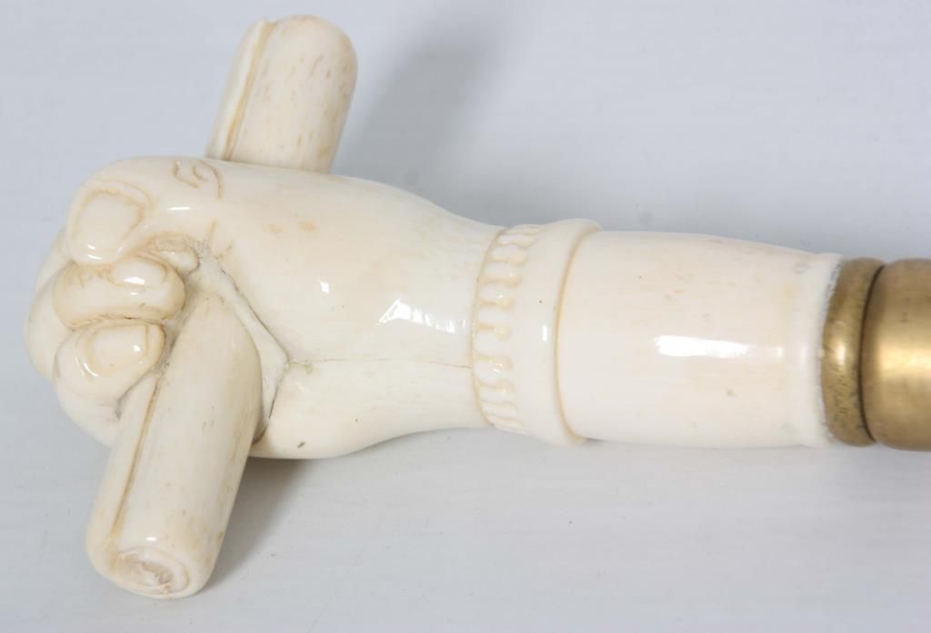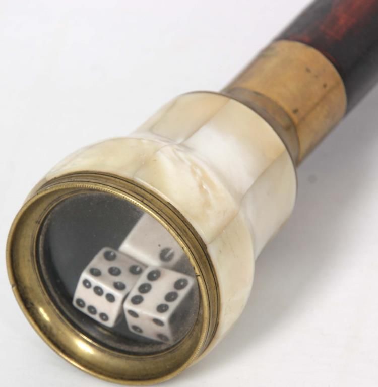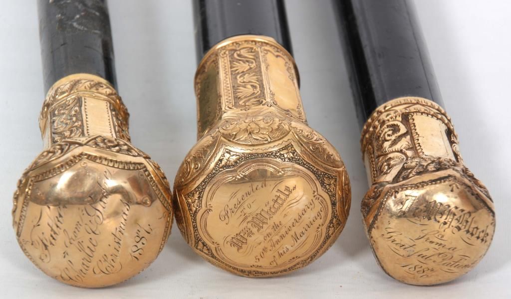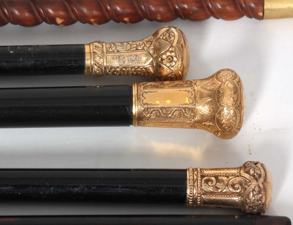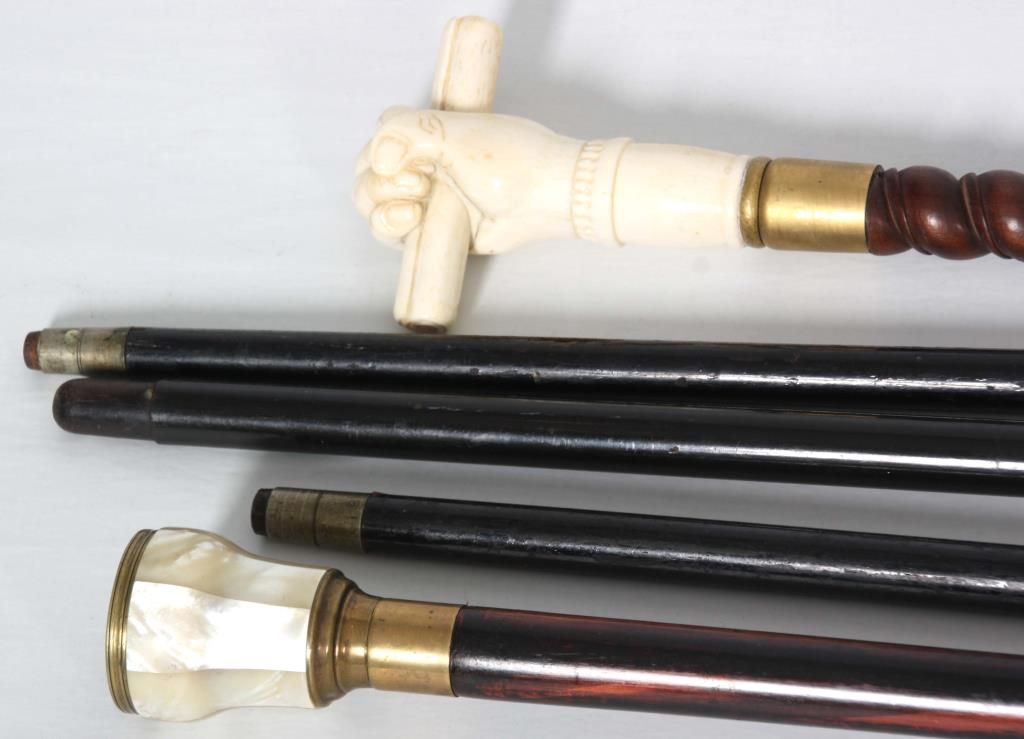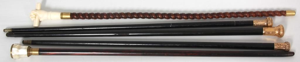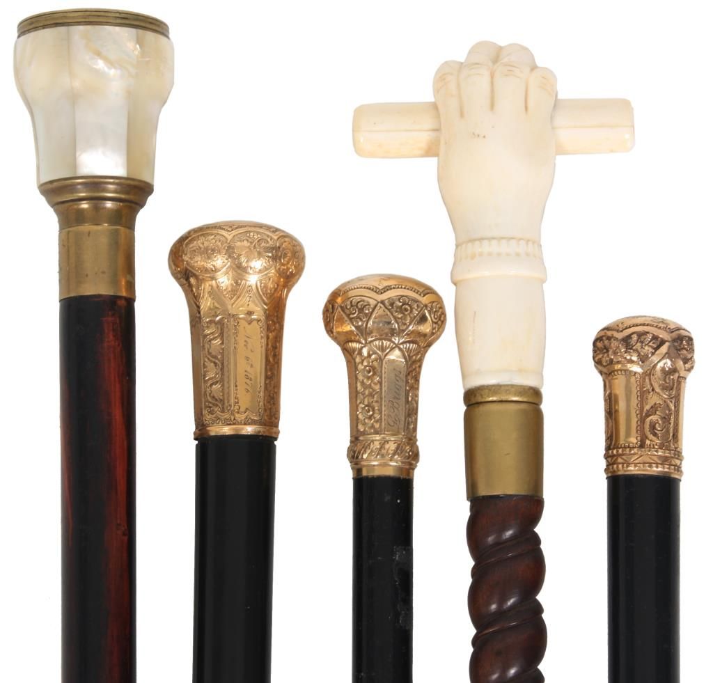 Lot of 5 Antique Canes. 3 presentation canes having gold filled knob handles with fancy filigree design and tapered ebonized wood shafts, measuring 36.5 in., 36 in., & 34.5 in. long, the smaller cane is marked R.F.S. & Co. the forth cane has a carved walrus tusk handle in the form of a right hand holding a paper scroll, assembled from multiple pieces with visible stress line and a few natural seams, has a brass collar and a spiral turned walnut shaft, 36 in. long. The fifth is a gambler’s cane with 7 panel mother of pearl cup with brass mounts on the handle, has 3 dice contained within the cup visible through the glass top, has a turned ebony wood shaft, 35.5 in long.
