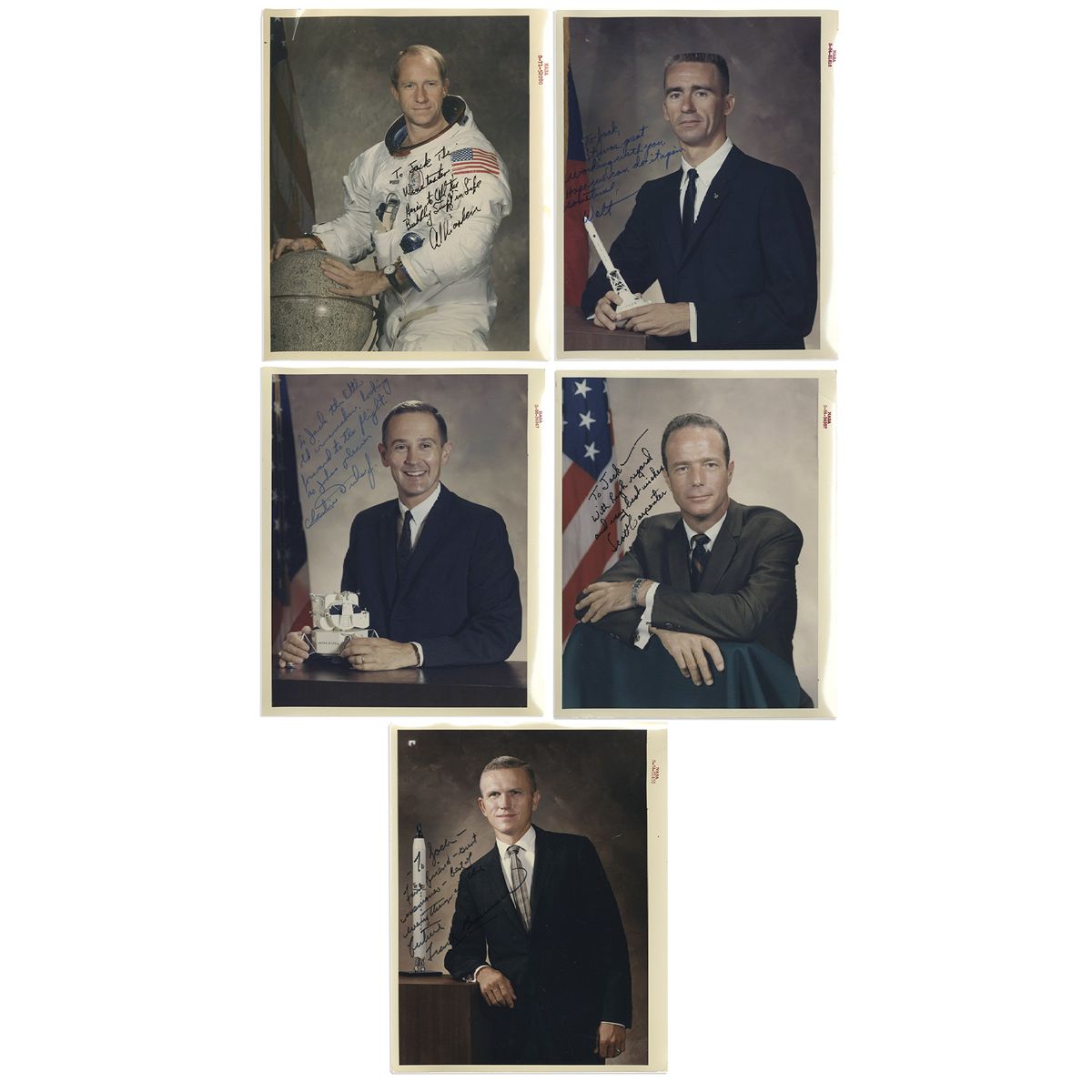 Excellent assortment of Apollo astronaut photos signed and dedicated to Jack Swigert; 5 photos from his personal collection. Scott Carpenter inscribes, ''To Jack - / With high regard / and very best wishes / Scott Carpenter''. Photo features the NASA publicity blurb on verso, as do the photos of Walter Cunningham (who signs simply ''Walt''), Frank Borman and Charles Duke. Al Worden photo has a plain verso. Each color glossy photo measures 8'' x 10''. In near fine condition save for buckling.