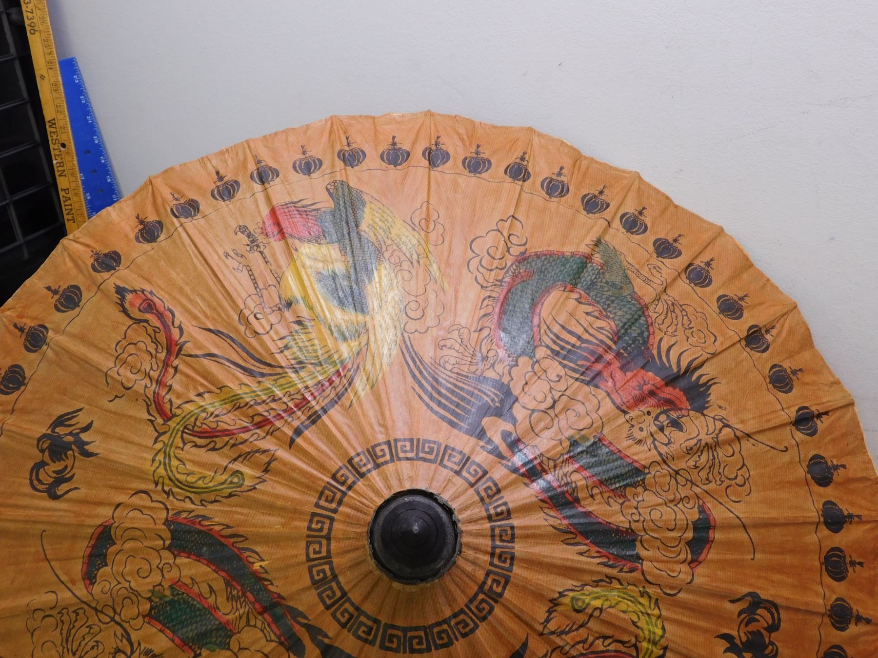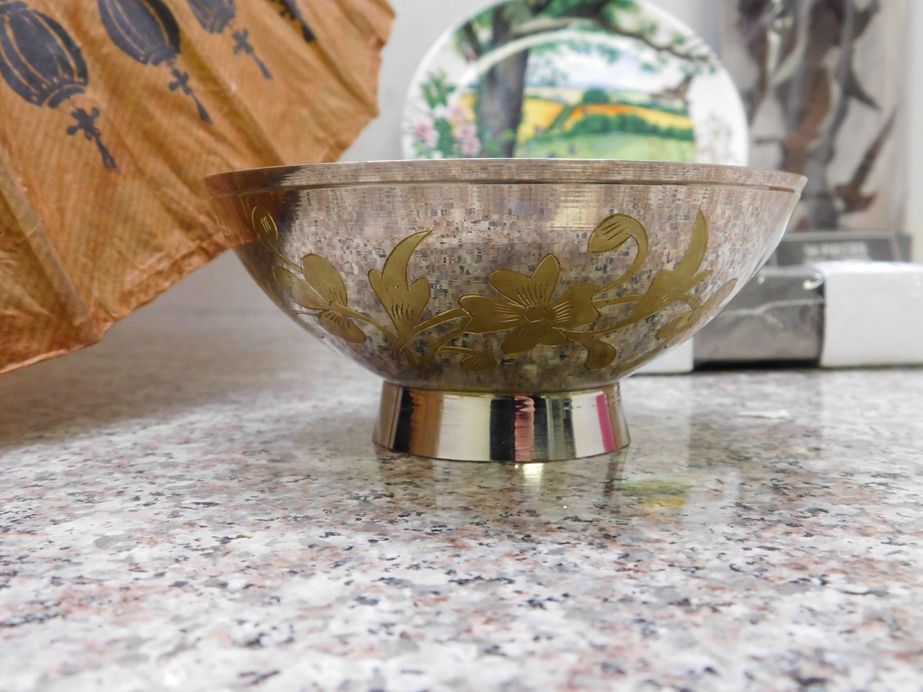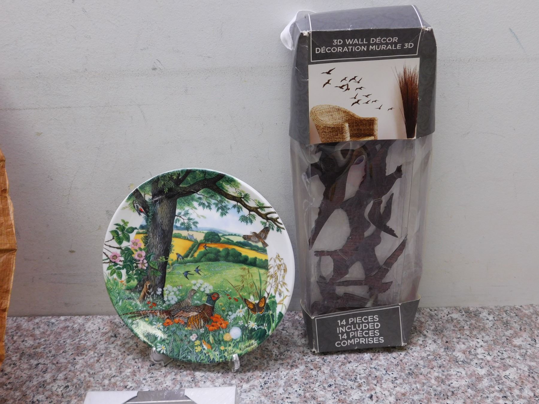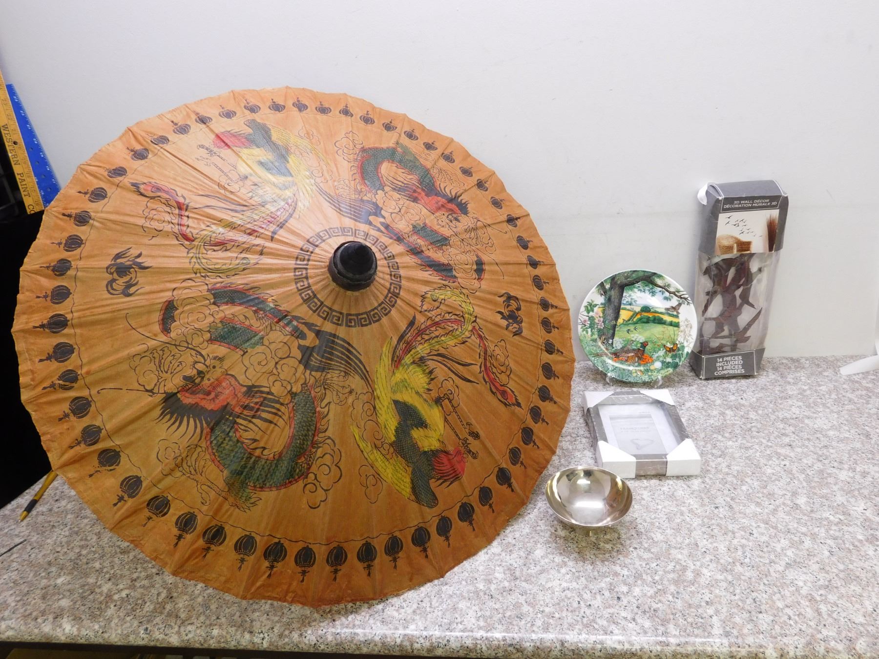 Lot of 5 Asian Paper Fan, Collectibe Plate, Wooden Bird Wall Decor, Frame, Bowl