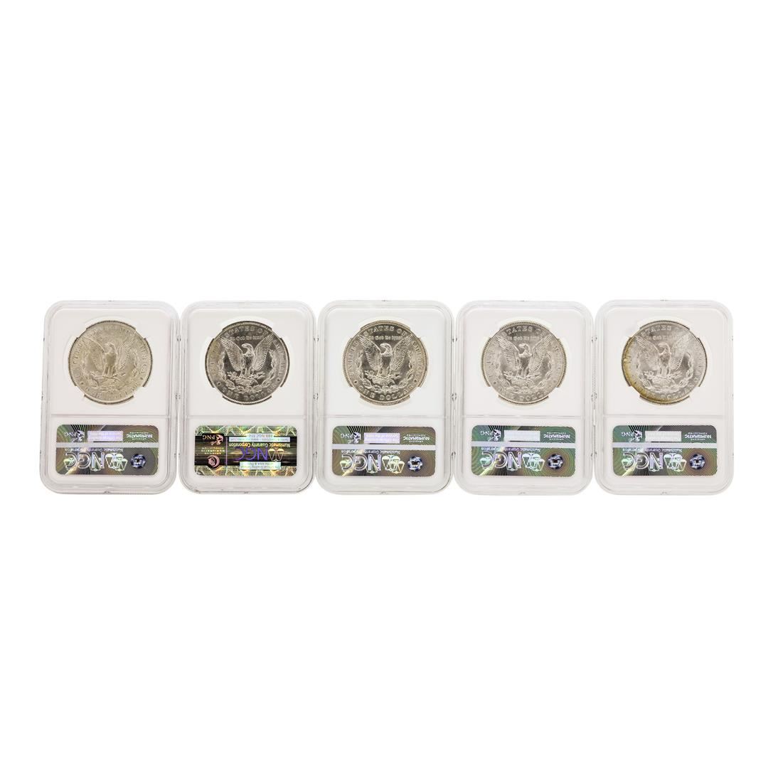 One Lot of (5) Assorted $1 Morgan Silver Dollar Coins NGC MS63. NGC Certified.