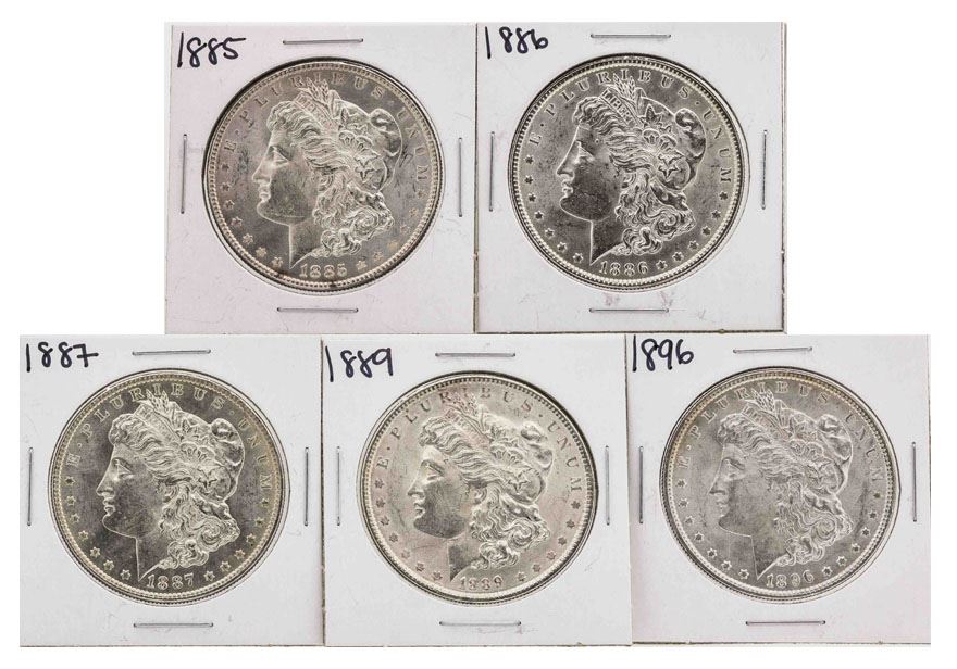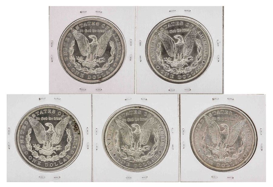 One Lot of (5) Assorted Date $1 Morgan Silver Dollar Coins.