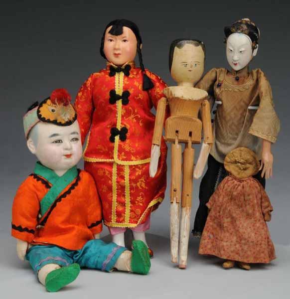Description German Pegged-wood, Ca. 1900; Vintage Chinese compo and cloth child, all original; modern Chinese compo, all original; antique Chinese Opera doll with elaborate head dress, all original. Condition (Excellent). Size Largest: 11" T.
