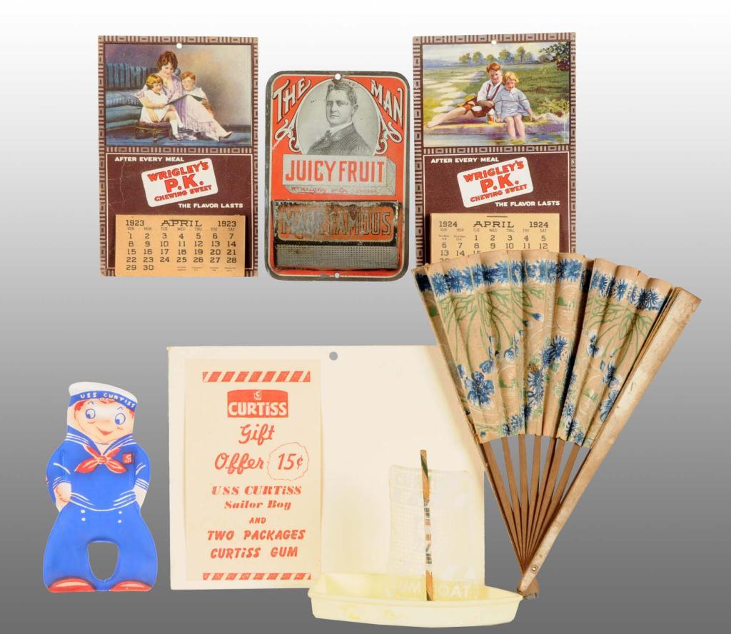 Description Includes one tin Juicy Fruit match safe, one fan with soiling, one Curtiss boat with sailor and corresponding trade card, and two Wrigley's Chewing Gum calendars. Denting, paint loss, and staining throughout with overall wear. Various sizes. Condition (Good - Excellent).