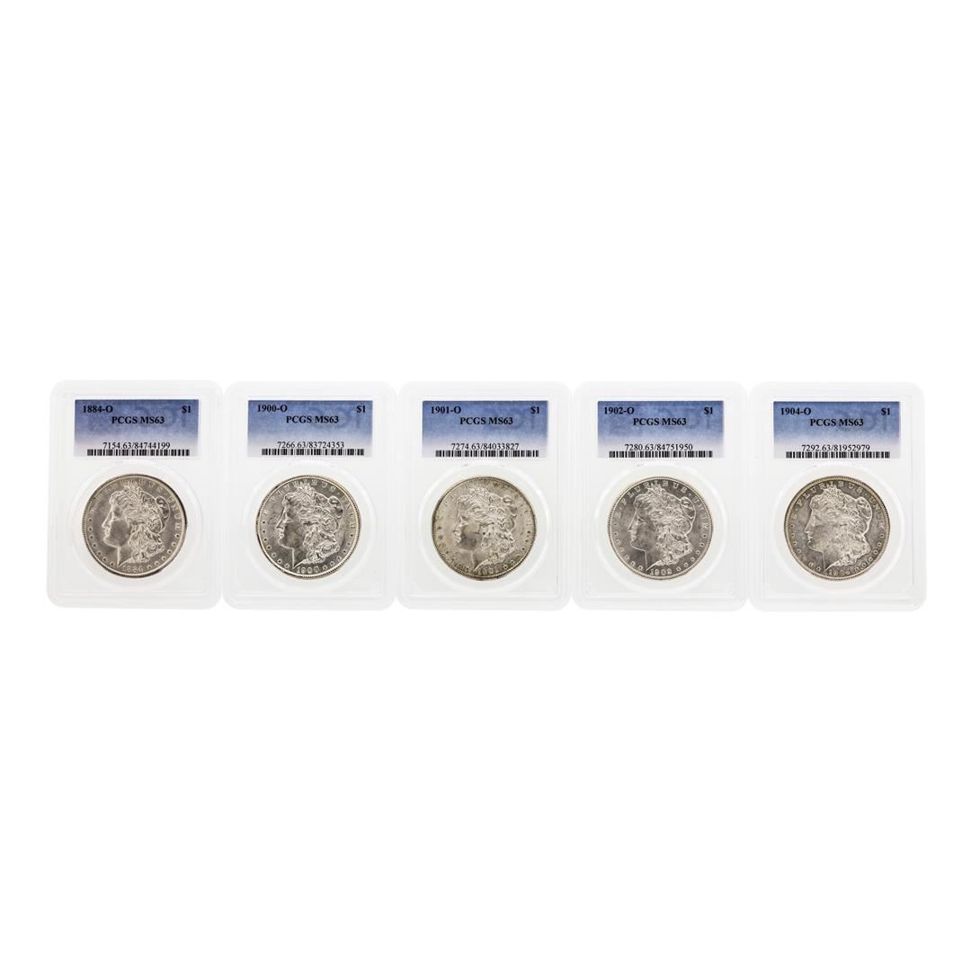 One Lot of (5) Assorted New Orleans Mint $1 Morgan Silver Dollar Coins PCGS MS63. PCGS Graded.