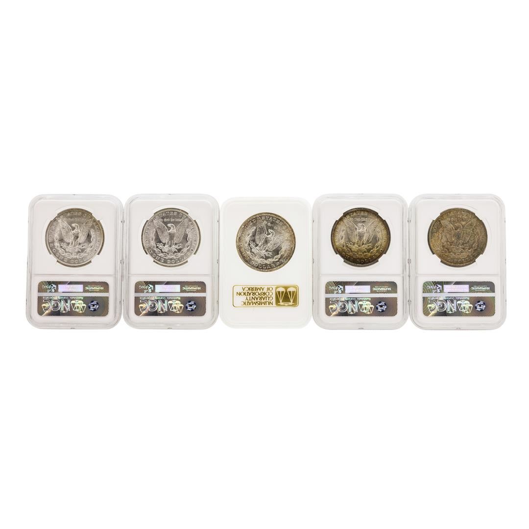 One Lot of (5) Assorted Philadelphia Mint $1 Morgan Silver Dollar Coins NGC MS64. NGC Certified.