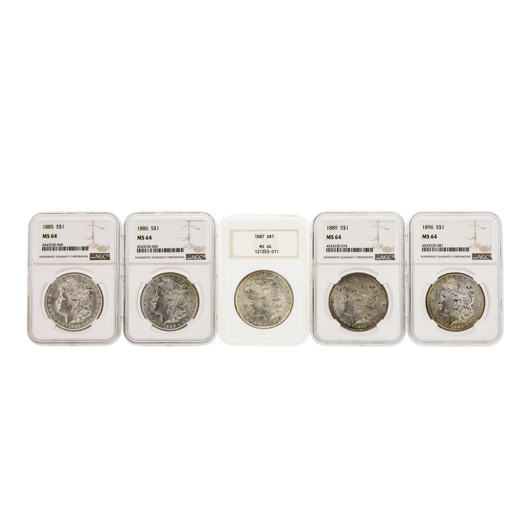 One Lot of (5) Assorted Philadelphia Mint $1 Morgan Silver Dollar Coins NGC MS64. NGC Certified.