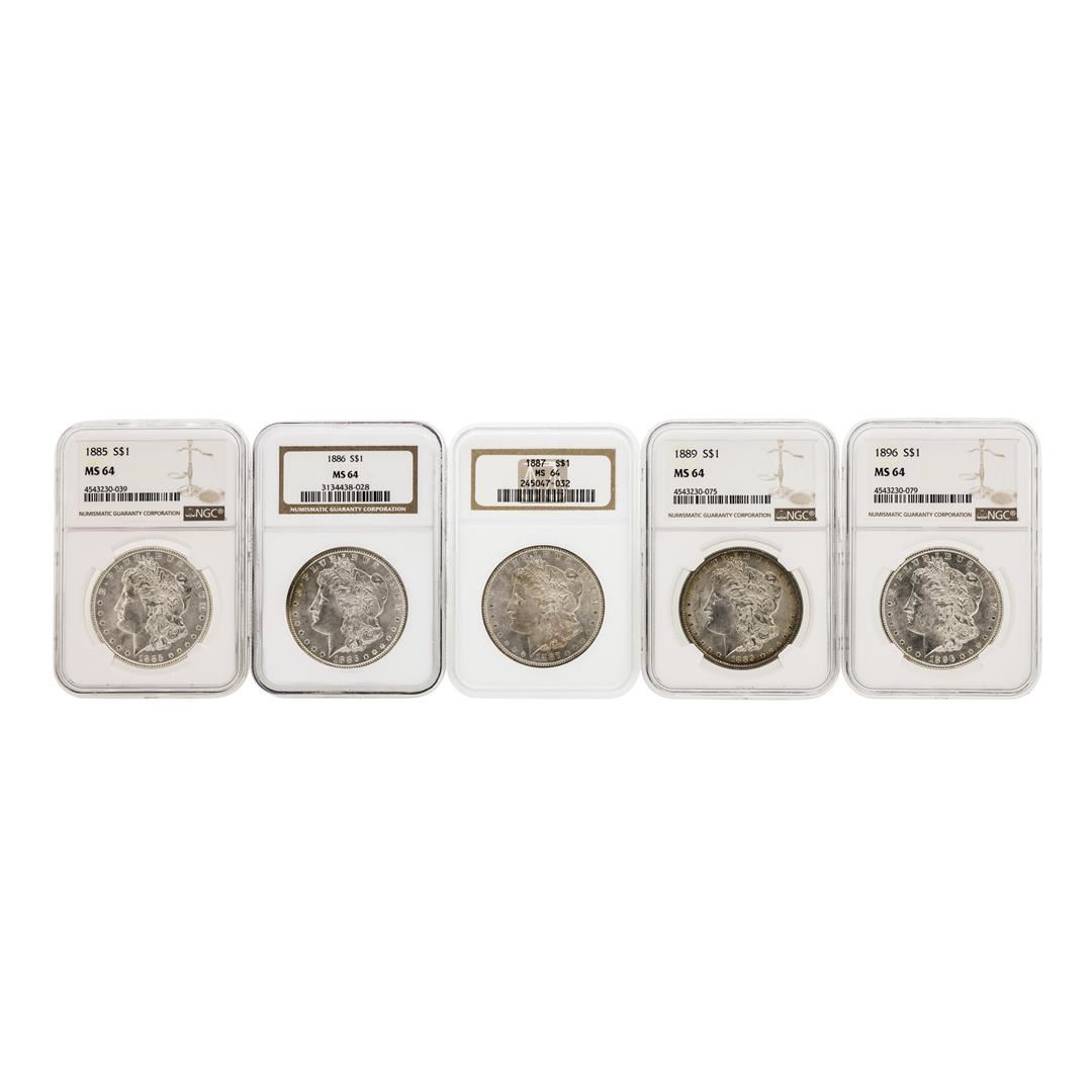 One Lot of (5) Assorted Philadelphia Mint $1 Morgan Silver Dollar Coins NGC MS64. NGC Certified.