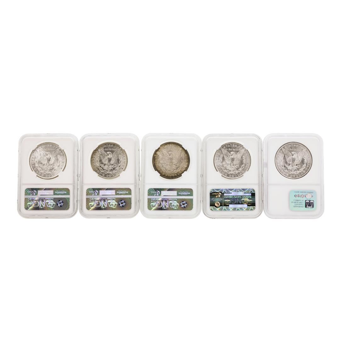 One Lot of (5) Assorted Philadelphia Mint $1 Morgan Silver Dollar Coins NGC MS64. NGC Certified.