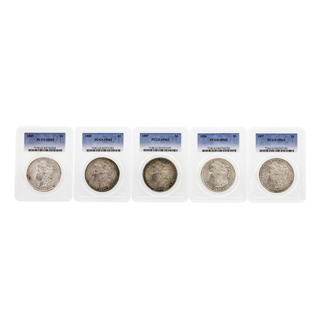 One Lot of (5) Assorted Philadelphia Mint $1 Morgan Silver Dollar Coins PCGS MS63. PCGS Graded.