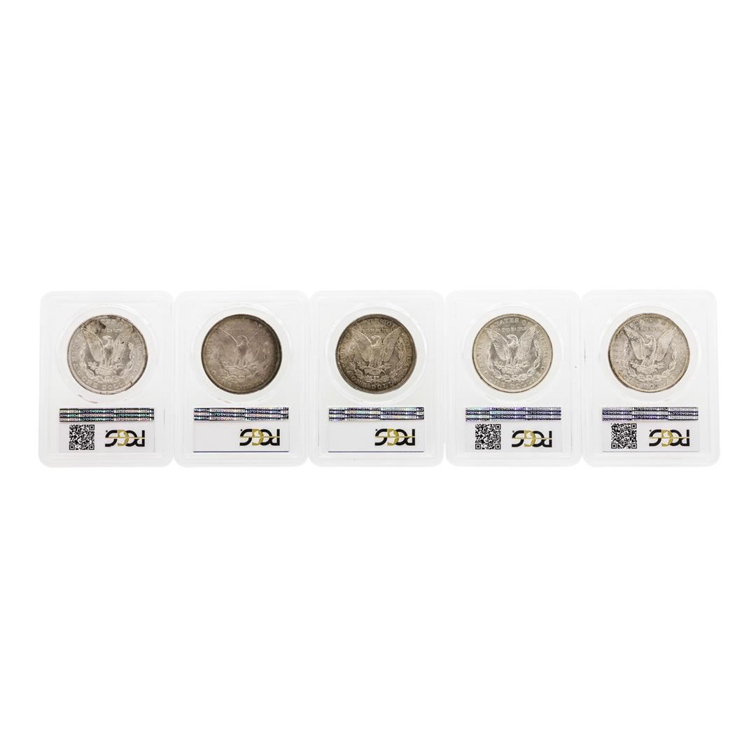 One Lot of (5) Assorted Philadelphia Mint $1 Morgan Silver Dollar Coins PCGS MS63. PCGS Graded.