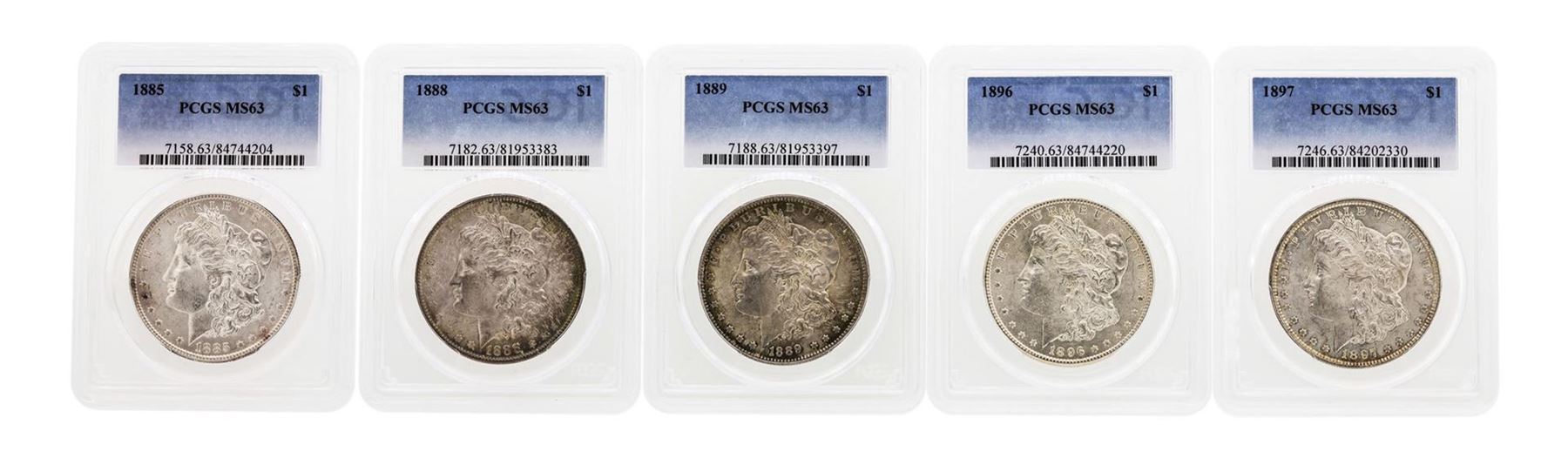 One Lot of (5) Assorted Philadelphia Mint $1 Morgan Silver Dollar Coins PCGS MS63. PCGS Graded.