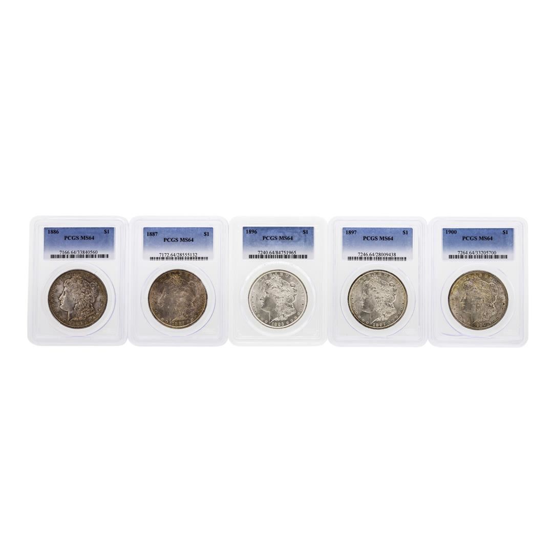 Lot of (5) Assorted Philadelphia Mint $1 Morgan Silver Dollar Coins PCGS MS64