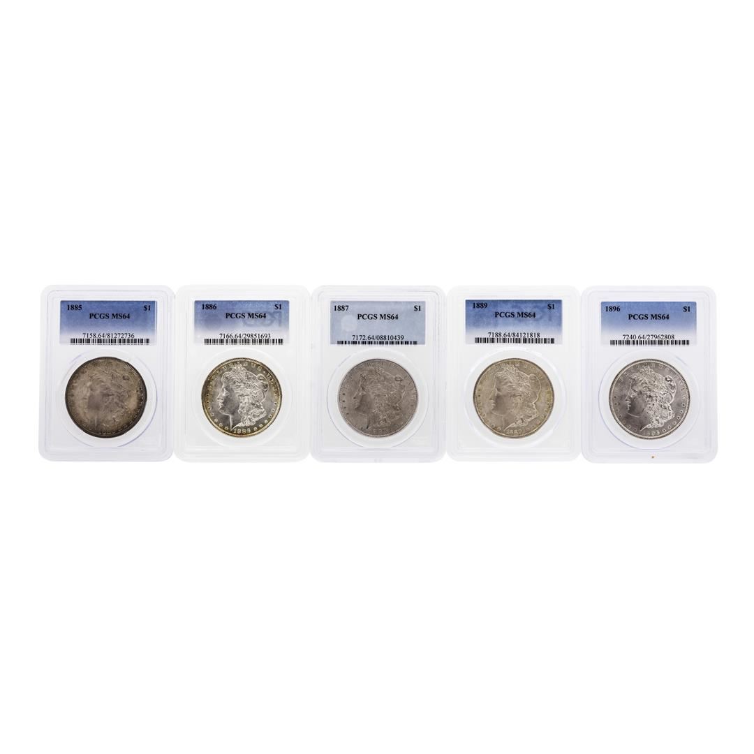 One Lot of (5) Assorted Philadelphia Mint $1 Morgan Silver Dollar Coins PCGS MS64. PCGS Graded.