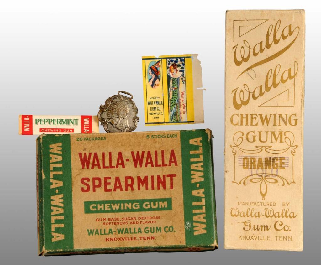 Description Includes early Walla-Walla chewing gum box with "Orange" crossed out by the factory and "Tulu" stamped underneath. This gum claims to be medicinal, which would have been before the FDA Act of 1909. Also includes stick of peppermint gum, early Walla-Walla wrapper with nice graphics for blended fruit chewing gum and with some tearing, a rare Walla-Walla gum fob with Indian depicted on front, and a newer Walla-Walla Gum Spearmint box with a couple of torn corners and surface dirt. Condition (Very Good - Excellent). Size Chewing gum box: 8 - 1/2" x 3".