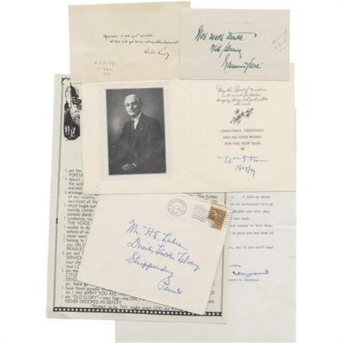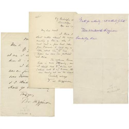 <B>Lot of 5 Author Autographs</B></I> including a signed quote by Thomas Wentworth Higginson <I>Truth for authority; not authority for truth.</B></I>, and two other letters by Higginson, and autographs by Kennett Harris, Waldo Kung, William T. Kerr and Frederick R. Kirkland in various forms and sizes, all in very good condition. <BR><BR><b>Shipping:</b> Flat Material, Small (<a target="_blank" href="http://www.heritageauctions.com/common/shipping.php">view shipping information</a>)