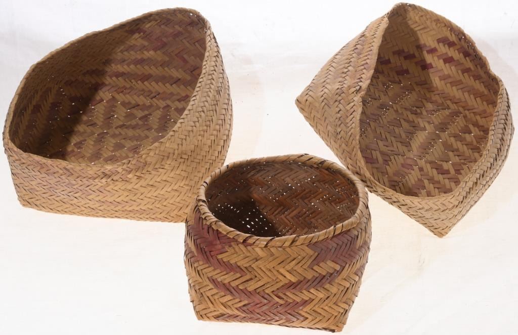 Set of 3 hand woven storage baskets. They all have a matching red-purple pattern. The largest is 7.5” Wide by 4” deep. The smallest is 6” wide by about 4” deep, and Set of 2 southwest tray baskets with matching colors. 12” Wide by 1.25” deep.